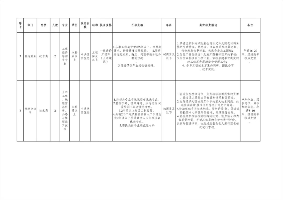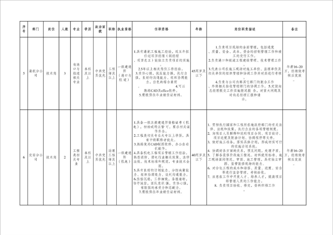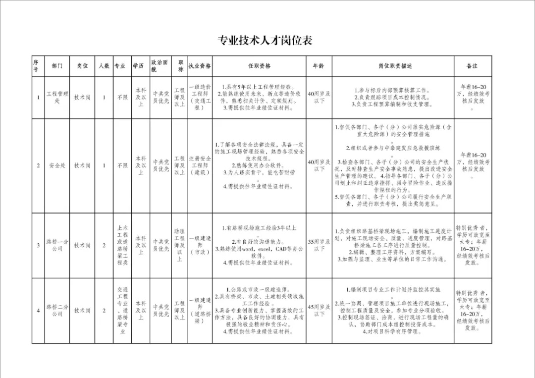 公開招聘持有一級(jí)建造師等資格證書、具有項(xiàng)目管理經(jīng)驗(yàn)和一定業(yè)績(jī)的專業(yè)技術(shù)人才15名,具體要求詳見附件(專業(yè)技術(shù)人才崗位表)。