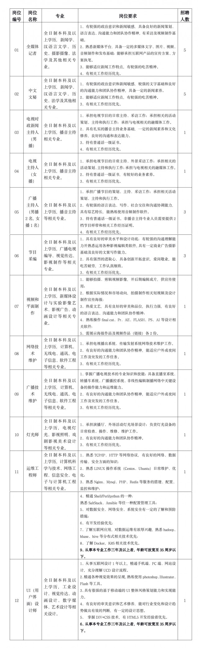 1、政治合格、遵紀(jì)守法、品行端正、身體健康。熱愛廣播電視事業(yè),積極進(jìn)取,開拓創(chuàng)新,符合相關(guān)崗位的招聘要求。