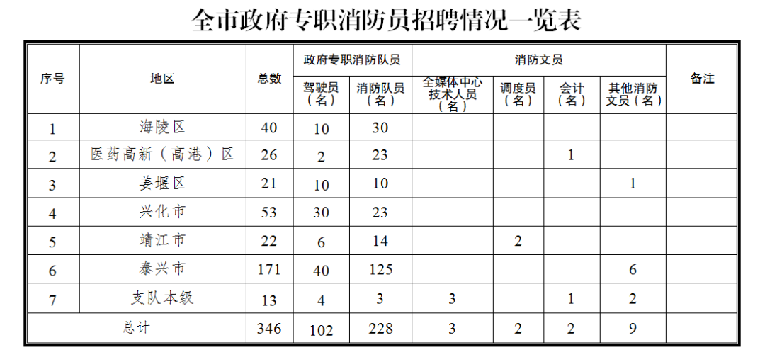 為更好護(hù)航泰州市社會(huì)經(jīng)濟(jì)發(fā)展,不斷提升綜合消防救援能力,根據(jù)各地消防救援隊(duì)伍建設(shè)實(shí)際,泰州市消防救援支隊(duì)面向社會(huì)公開招聘346名政府專職消防員(附表1)?,F(xiàn)將有關(guān)事項(xiàng)公告如下:
