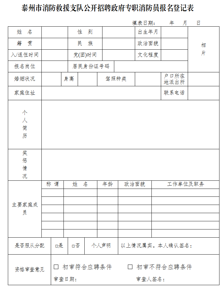采取網(wǎng)上和實(shí)地報(bào)名方式。應(yīng)聘者須填寫《泰州市消防支隊(duì)公開招聘政府專職消防員報(bào)名登記表》(附件2),同時(shí)將本人身份證、戶口本、學(xué)歷證書、戶口所在地派出所出具的無違法犯罪記錄證明、所報(bào)考崗位所需證書、退役軍人及國(guó)家綜合性消防救援隊(duì)伍退出消防員相關(guān)證明等材料復(fù)印件發(fā)送至對(duì)應(yīng)報(bào)名單位的郵箱(添加時(shí)需要備注姓名、報(bào)名崗位、年齡、學(xué)歷、兵齡、隊(duì)齡)。