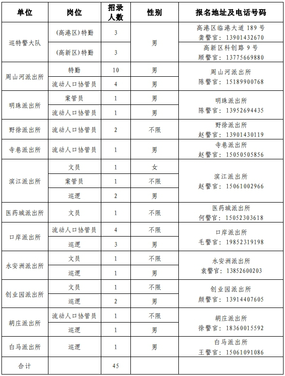 因工作需要,泰州市公安局醫(yī)藥高新區(qū)分局(高港分局)決定面向社會(huì)公開招聘45名警務(wù)輔助人員?,F(xiàn)就有關(guān)事項(xiàng)公告如下: