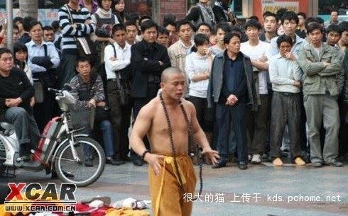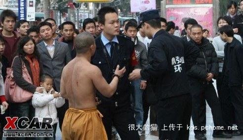 一個(gè)160左右的少林寺弟子,在深圳華強(qiáng)北賣藝,用酒瓶敲頭,林沖用的長槍插自己,開始有4個(gè)城管叫他走,他沒有理會(huì),4個(gè)城管也在旁邊看,邊打電話,隨后和尚18般武藝都使出來了,后來來了一車城管,想直接去砸和尚的東西,開始4個(gè)城管就對他們說,他功夫厲害,30多個(gè)城管拿棒子準(zhǔn)備打架的狀態(tài),城管說你走不走,和尚說這里是中國人的地方我就不走,有本事抓我槍斃,要打架,我不怕你人多,隨后大叫一聲,用手直接把磚頭敲碎了,城管老大看見以后就說,你要講道理,出家人不要喊打打殺殺,現(xiàn)場的人全部笑了 !——網(wǎng)友言