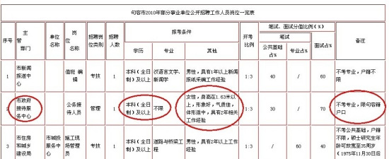 畫圈處為遭質(zhì)疑的招聘職位及其條件。 日前,一份江蘇句容市2010年部分事業(yè)單位招聘簡章“遭圍觀”。 網(wǎng)友稱句容市政府接待服務中心工作人員應聘條件是“人為設置”,專為該市一副市長侄女王夢媛量身打造,對此,該市人社局予以否認,稱招聘條件系用人單位據(jù)崗位需要設定,符合者有4人。 網(wǎng)友圍觀:句容事…